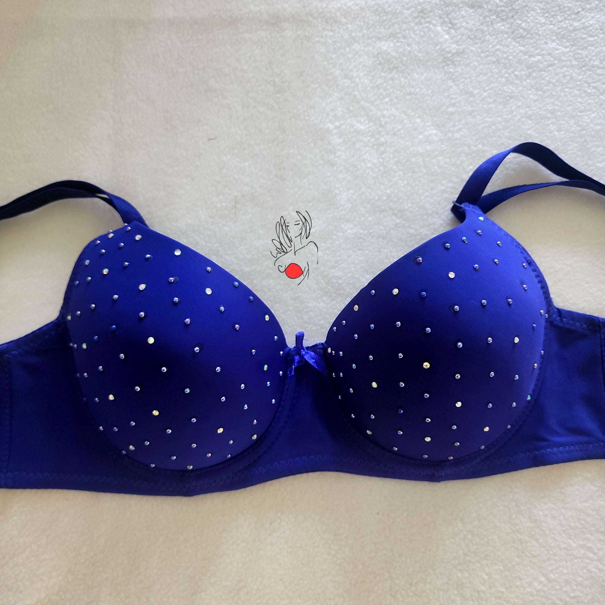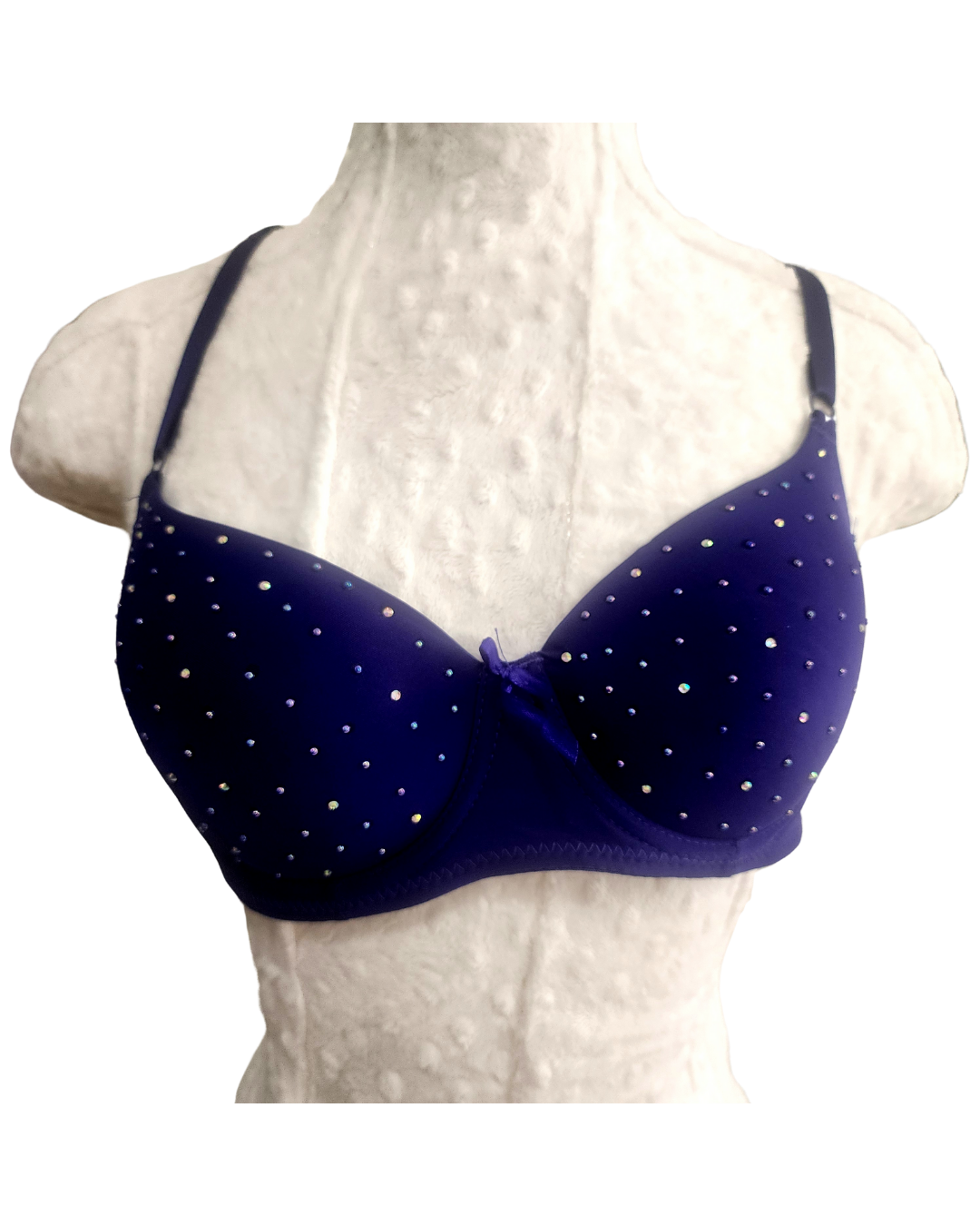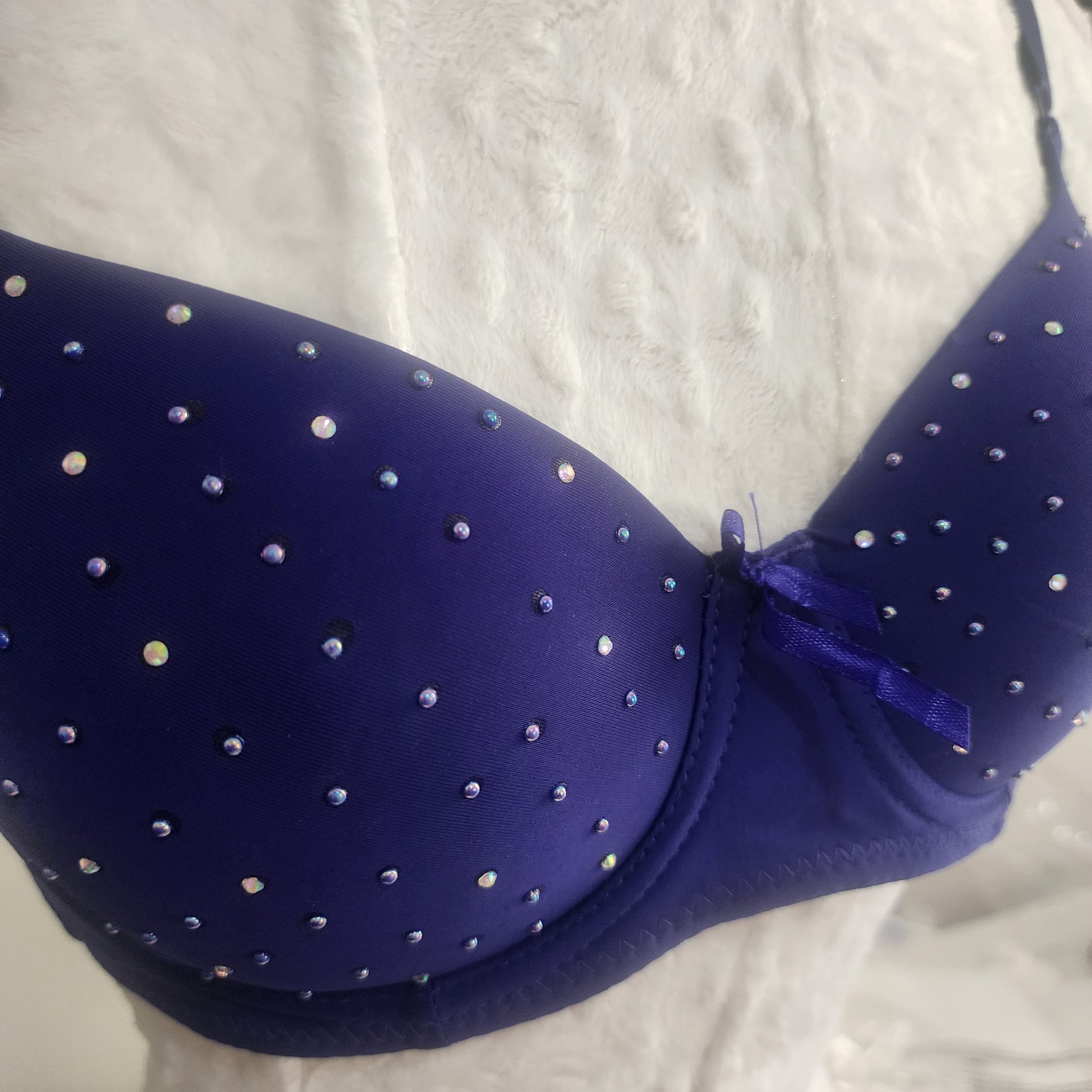 Este bra color violeta tamaño 36B es el complemento perfecto para cualquier outfit. Su diseño único y la incorporación de cristales lo hacen elegante y sofisticado. Además, su tamaño asegura un ajuste cómodo y favorecedor. No te pierdas la oportunidad de lucir impecable con este hermoso bra.