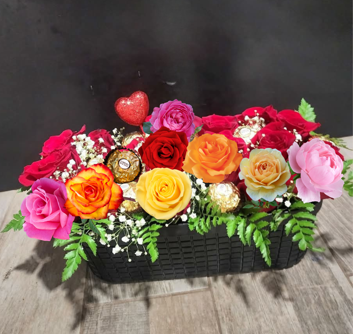 Arreglo flora con 15 rosas puedes escoger entre rojas, rosas o mixtas. 7 chocolates