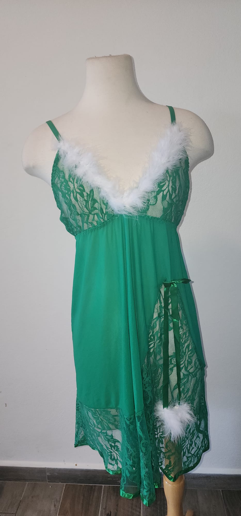¡Luce hermosa y siente la magia en esta Babydoll de Santa Verde! Esta preciosa prenda semi-transparente de color verde es adornada con plumas encantadoras, proporcionando un look sublime y elegante que le hará destacar en la pista de baile. ¡Beautiful en su máxima expresión!