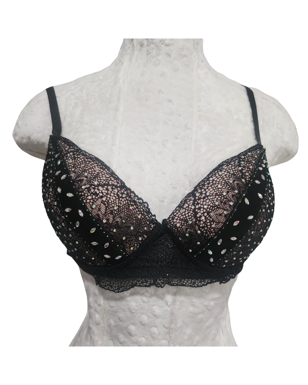 Este sujetador negro y nude está diseñado con encaje y adornado con barilla brillante para un look elegante y sexy. Hecho para la talla 38B, ofrece un ajuste cómodo y soporte para una apariencia favorecedora. El encaje y el brillo agregan un toque de sofisticación a tu intimidad.