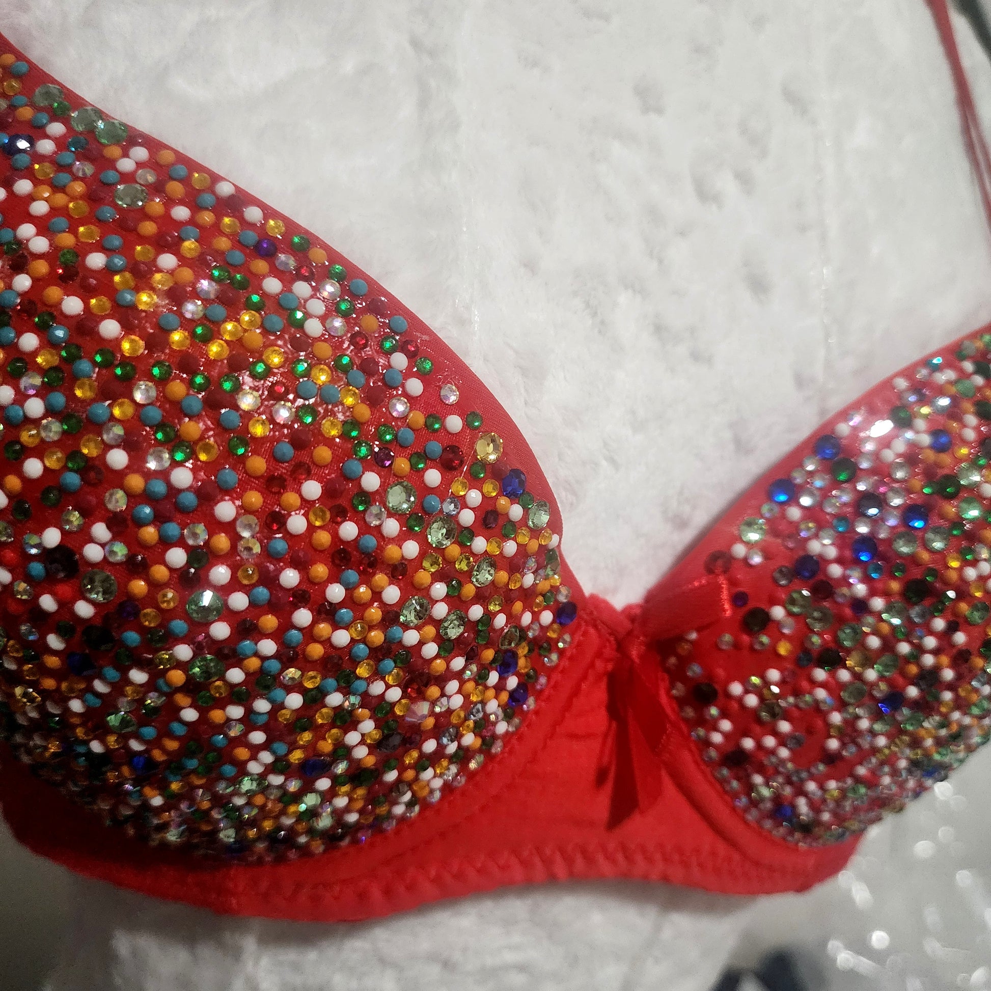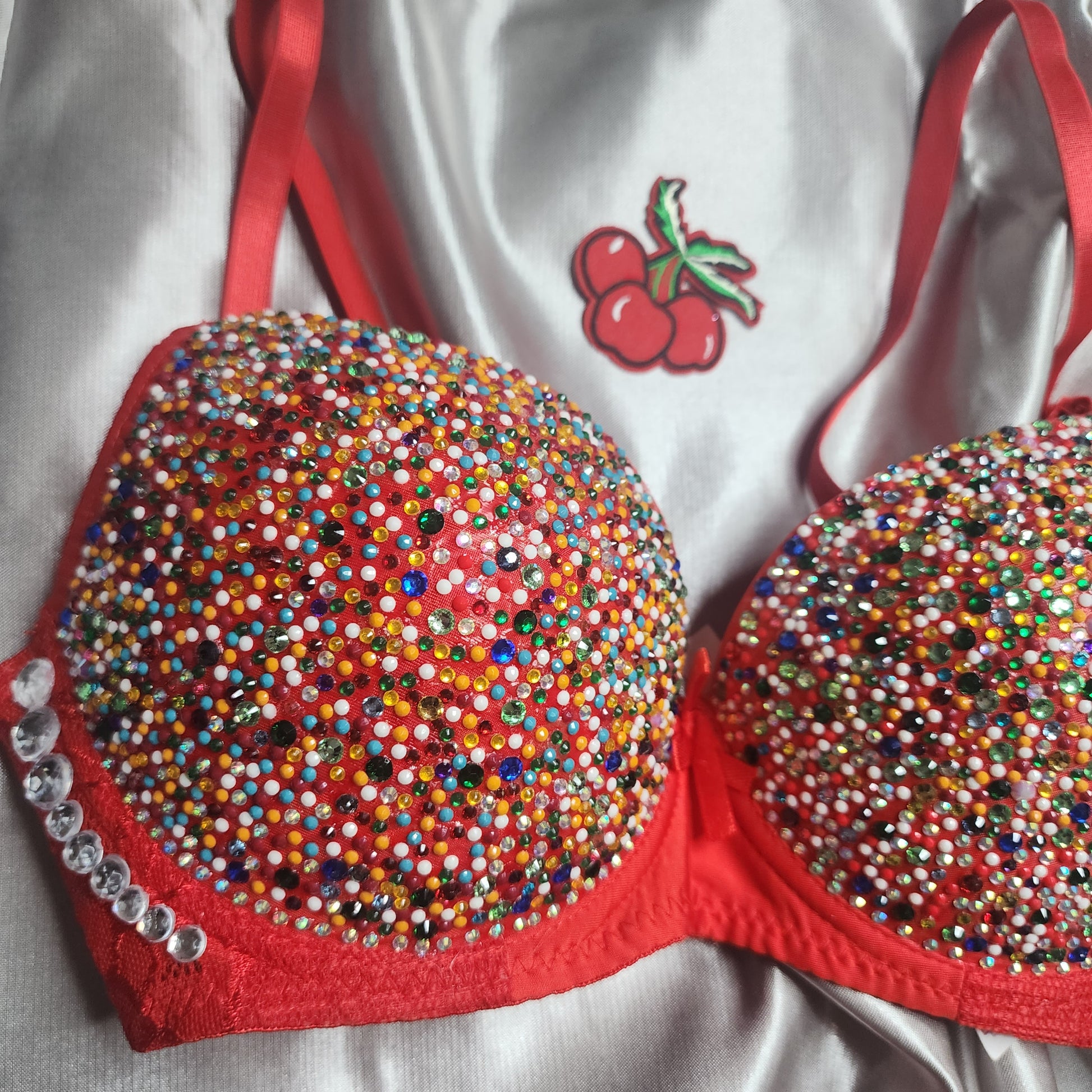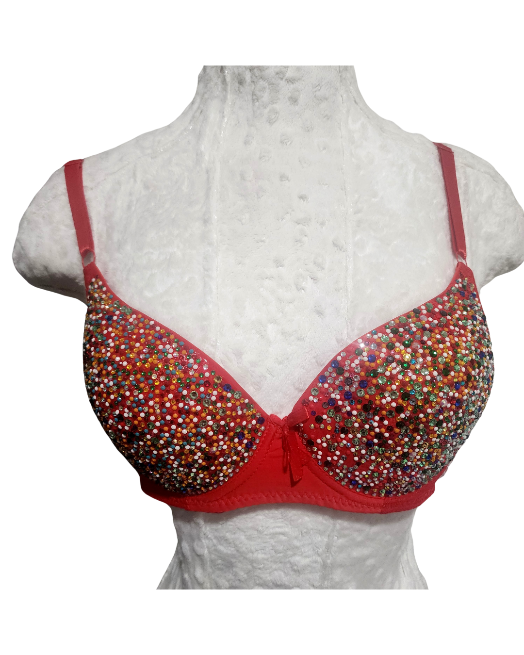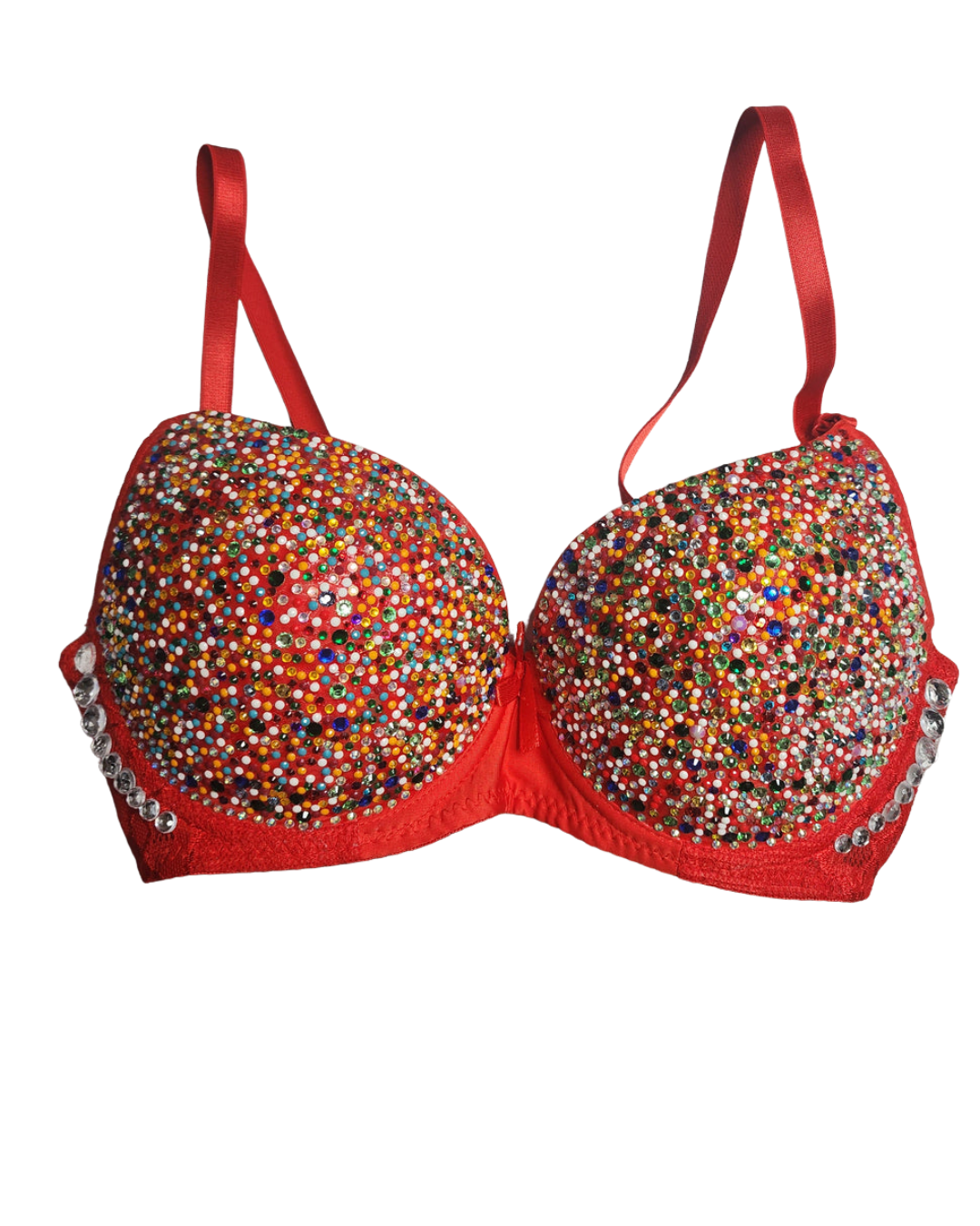 ¡Haz una declaración de moda con nuestro increíble bra rojo Confetti! Con sus piedras de colores y su diseño interesante, esta lencería única no solo te hará sentir bella y segura, sino que también llamará la atención de todos. ¡Añádelo a tu colección de ropa interior hoy mismo!