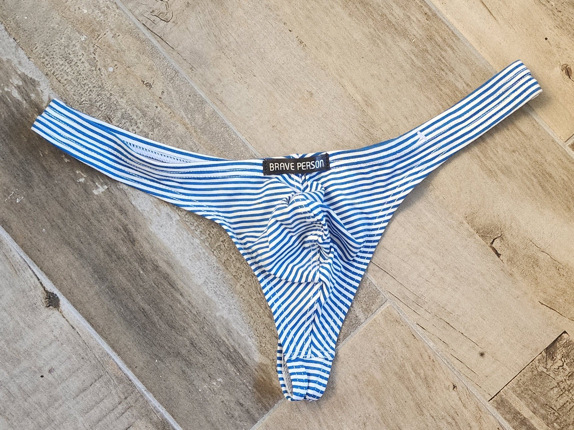 Este pantaloncillo tipo bikini de hombre Brave Person es una elección moderna y minimalista para tu guardarropa. Está hecho de un material suave y resistente y tiene rayas crudas blancas y azules para otorgar un look moderno y casual. El cinturón elástico se ajusta perfectamente a tu cintura para un ajuste cómodo e ideal.