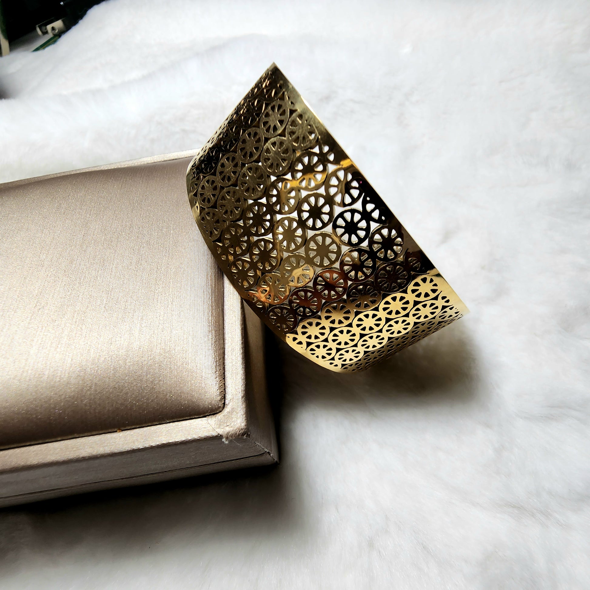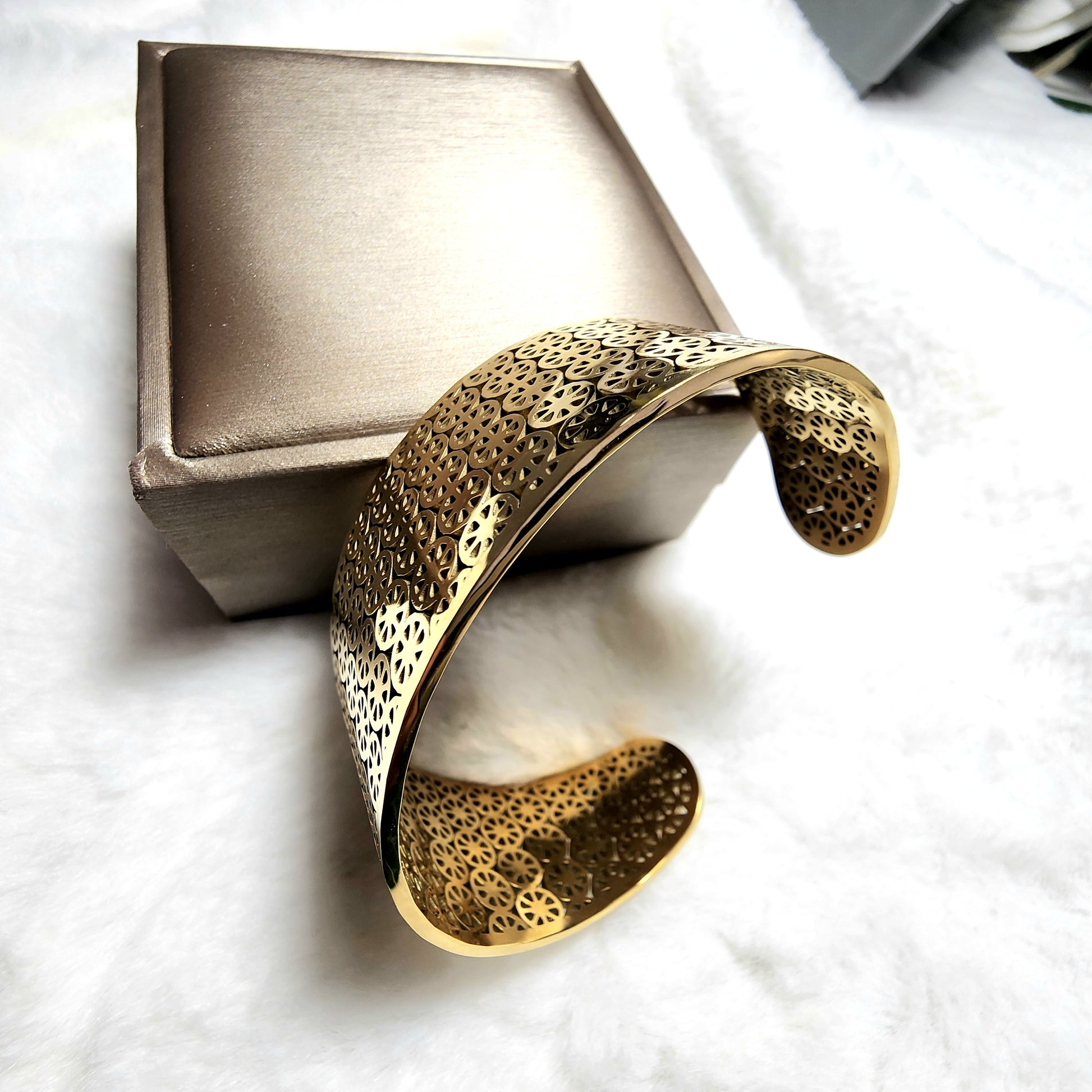 Este brazalete sólido es perfecto para agregar un toque de elegancia a tu outfit. Con su ancho y color dorado, la pulsera está hecha de acero inoxidable de alta calidad para mayor durabilidad. Un must-have en tu colección de accesorios para lucir sofisticada en cualquier ocasión.