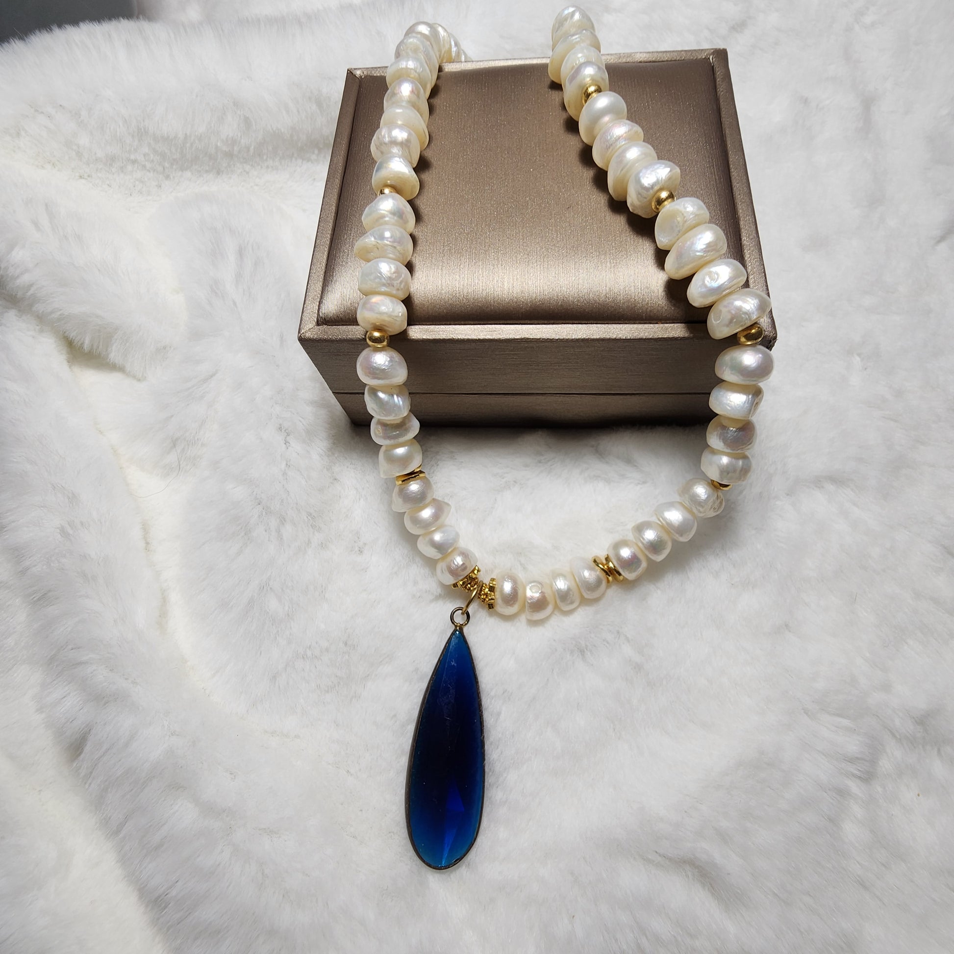 Este collar imitación perla con piedra azul será la pieza elegante que no puede faltar en tu joyería. Su diseño clásico y atemporal te hará lucir sofisticada y estilosa en cualquier ocasión. Combínalo con cualquier outfit y destaca con su brillo y elegancia. ¡Un accesorio imprescindible!