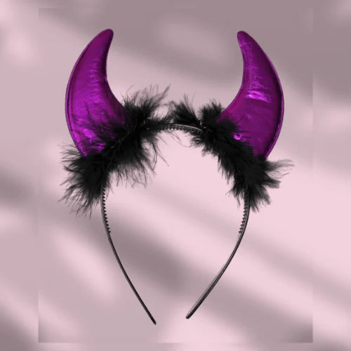 Luce como un diablito con esta diadema violeta con plumas negras. Perfecta para disfraces o como accesorio para lencería. ¡Atrévete a ser rebelde!