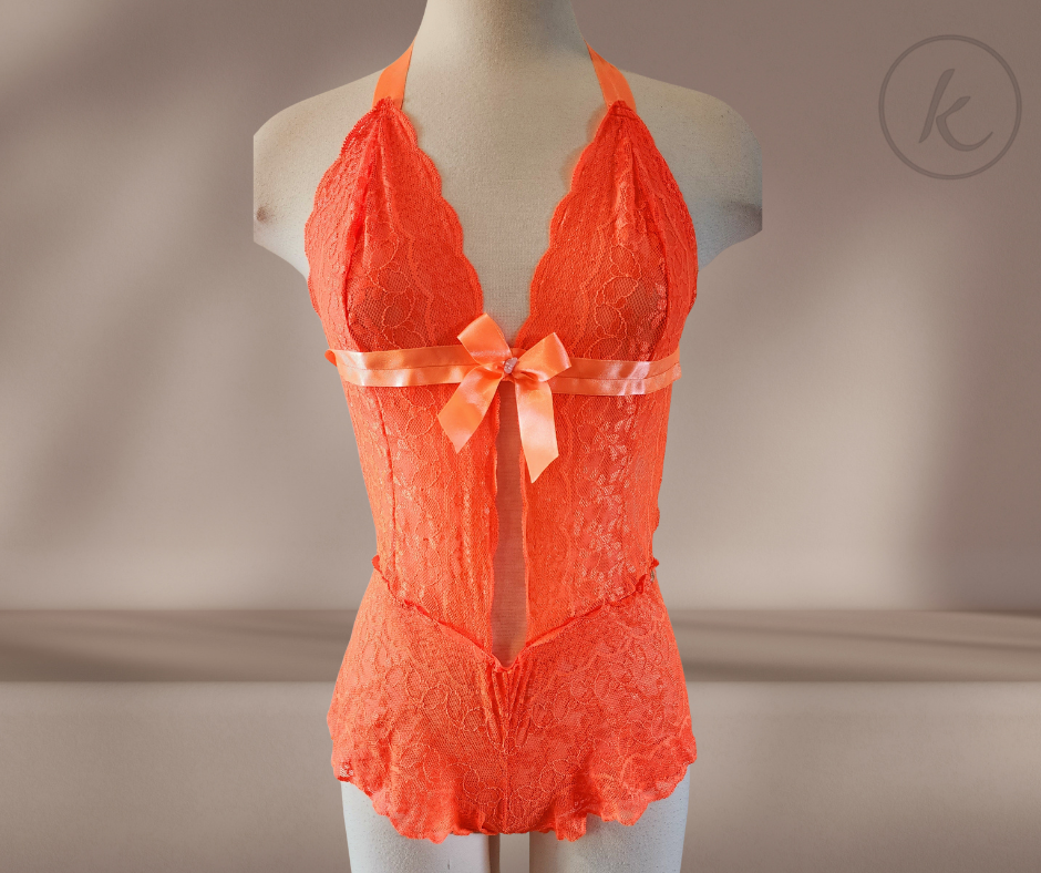 Enterizo de encaje color naranja. Hecho en Colombia incluye un cuarzo rosado preparado por una Terapeuta Reiki Enterizo Naranja