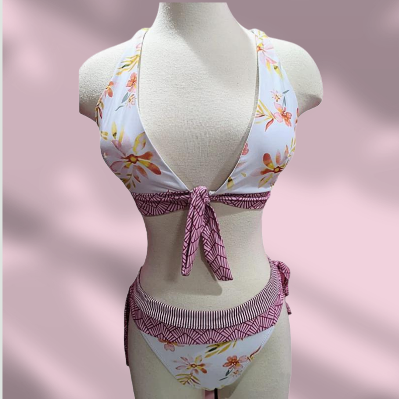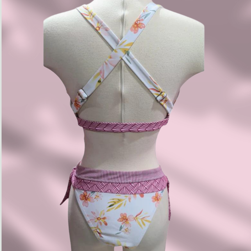 Traje de baño de dos piezas. Cruzado en la parte de atrás. La pantie se amarra por los lados