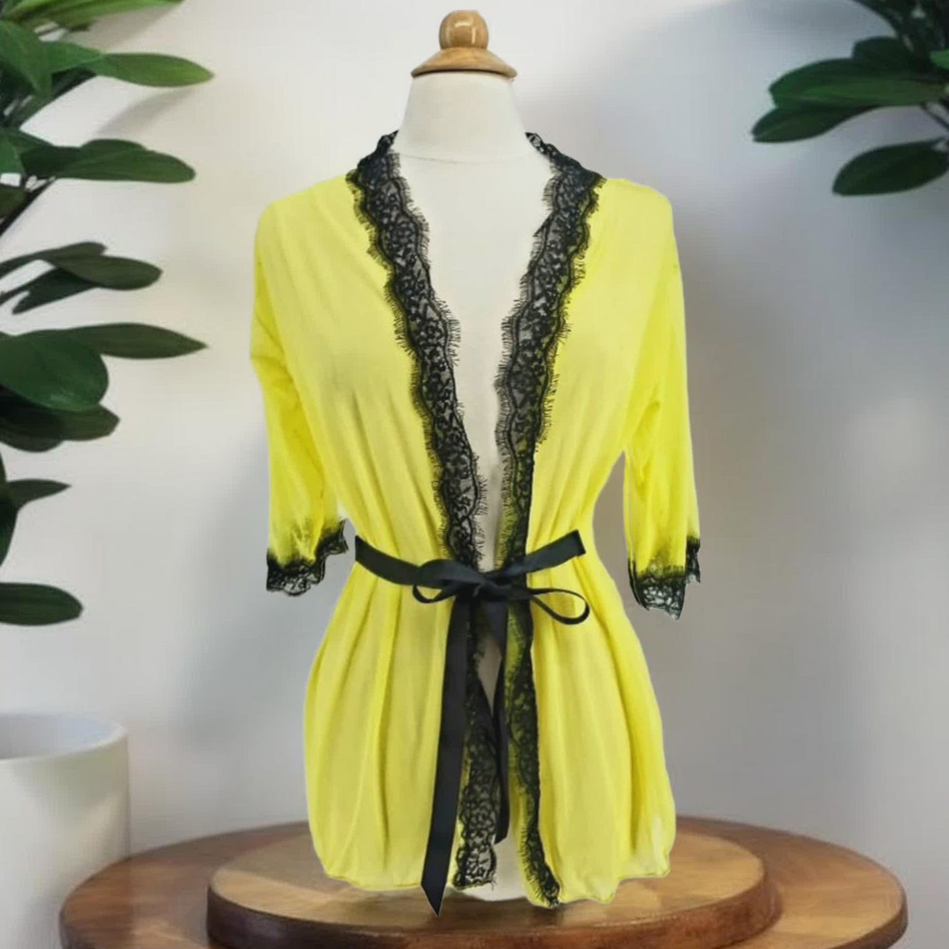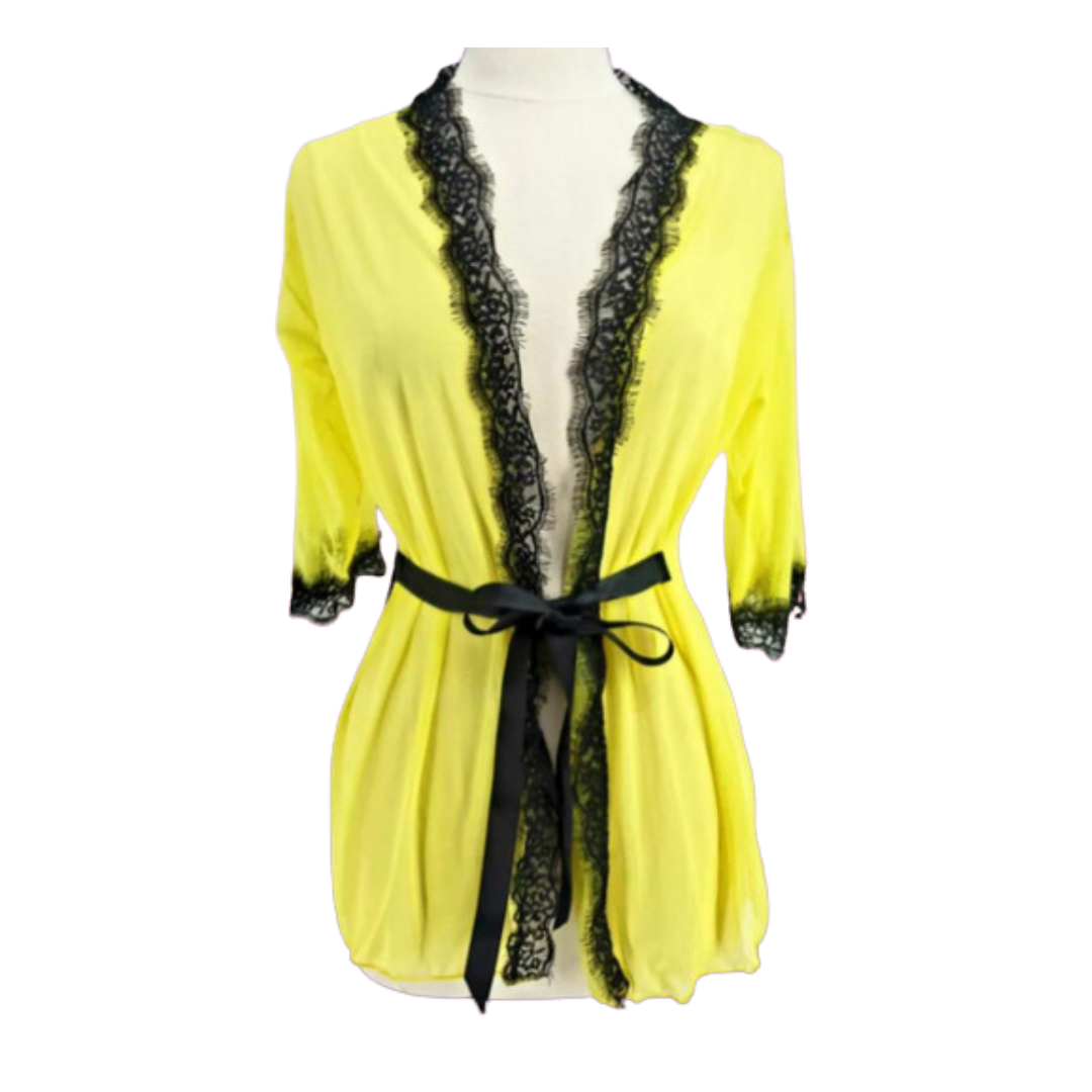¡Completa tu look de baño con nuestro kimono amarillo semitransparente! Hecho en Colombia, este kimono te proporcionará comodidad y estilo a la hora de salir del baño o al levantarte por la mañana. ¡Su color amarillo y negro le darán un toque moderno y único a tu atuendo!