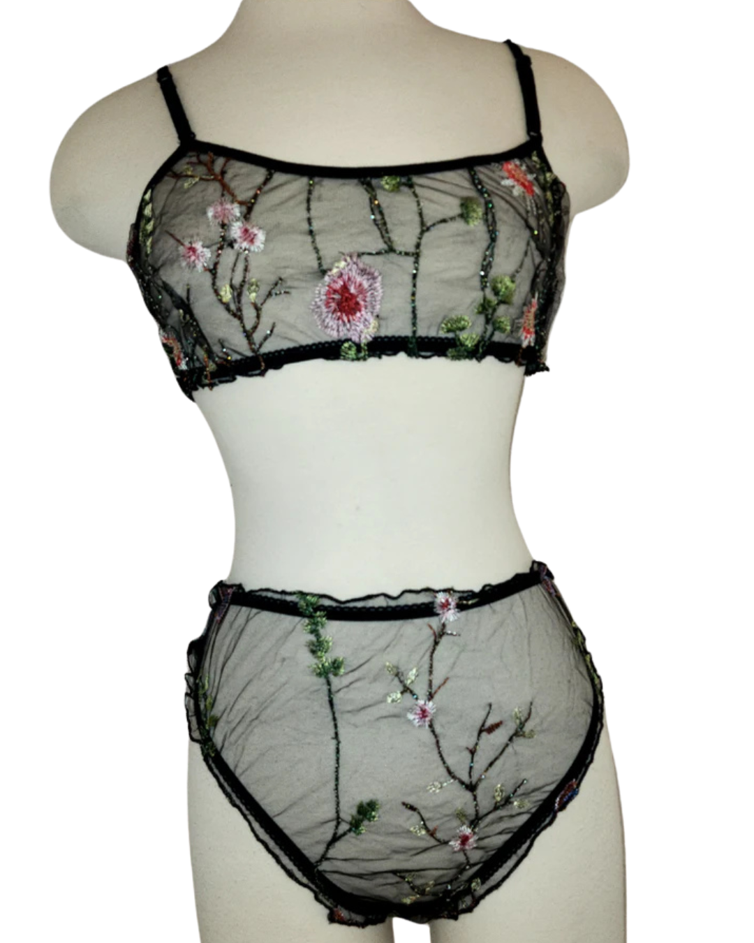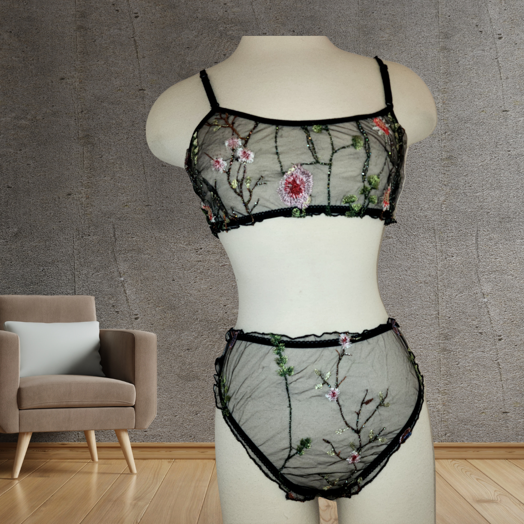 Con el set de dos piezas Linda, lucirás fina en cualquier ocasión. La delicada combinación de negro semitransparente y flores bordadas aporta un toque de elegancia a tu look. El top con mangas y el pantie alta te brindarán comodidad y estilo al mismo tiempo. ¡Perfecto para tus outfits más sofisticados!