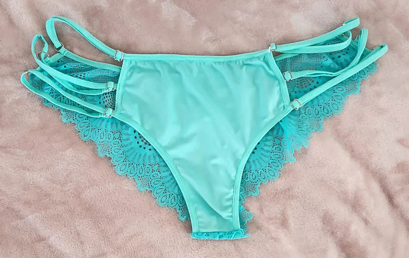 ¡Estilo, comodidad y calidad en uno! El pantie ajustable aquamarina está hecho de algodón licrado y encaje.