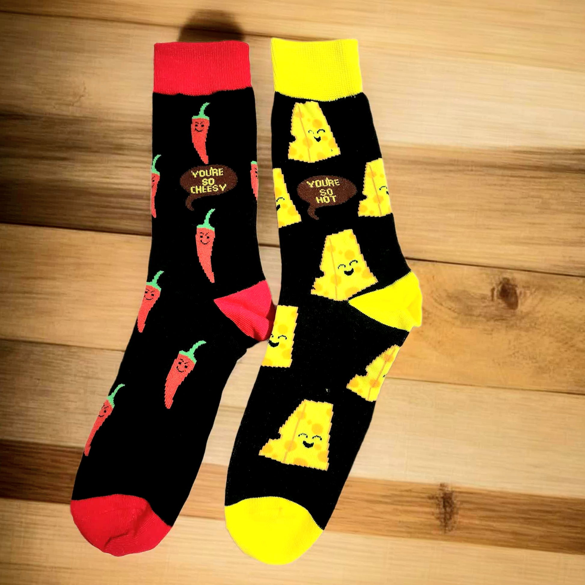 ¡Anima tu día con nuestras medias divertidas de chilli y queso! Perfectas para cualquier ocasión, desde hacer ejercicio hasta ir a la escuela o la universidad. Llena de energía tus actividades diarias con este divertido y original diseño. ¡Haz que tus pies sean el centro de atención!