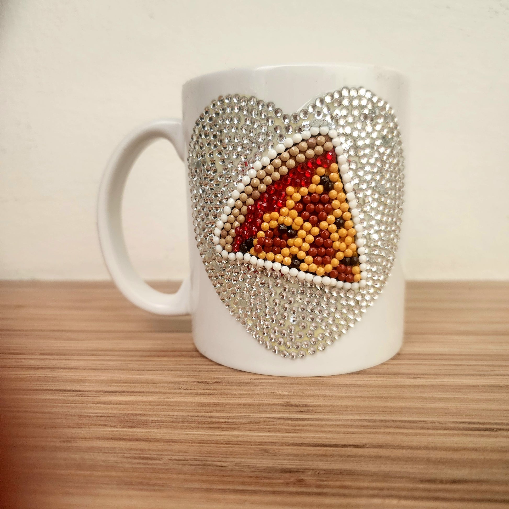 Taza de café con diseño en cristales de colores formando un pedazo de pizza
